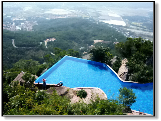 第3天早上一大早就去了興隆華僑城,介紹下當年華僑回來后,建設的諸多經(jīng)歷,之后直奔海景奇觀——“天下第一灣” 的亞龍灣,西園六道嶺向南延伸至濱海的山嶺為虎頭嶺,其一角稱“白虎角”。而紅霞嶺向東南延伸的山脈稱“亞龍嶺”,至濱海一角稱“亞龍角”,面對大海,應合了中國經(jīng)典之作,前有“罩,后有靠,左青龍、右白虎”的風水理念。也見到了傳說中的2014年的南海艦隊集群基地,見到了非2的外景拍攝地的吊橋,更見到了豪華別墅鳥巢和天堂泳池,景色別致,令人流連忘返?;貋淼穆飞?,導游不但介紹了沿途風光,還給我們講了些成功學的理念,諸如“讀萬卷書不如行萬里路,行萬里路不如閱人無數(shù),閱人無數(shù)不如緊跟成功者的腳步”,讓我說,我再加一句,“緊跟成功者的腳步不如自己去悟”;歸根到底,謀事在人,成事在天!